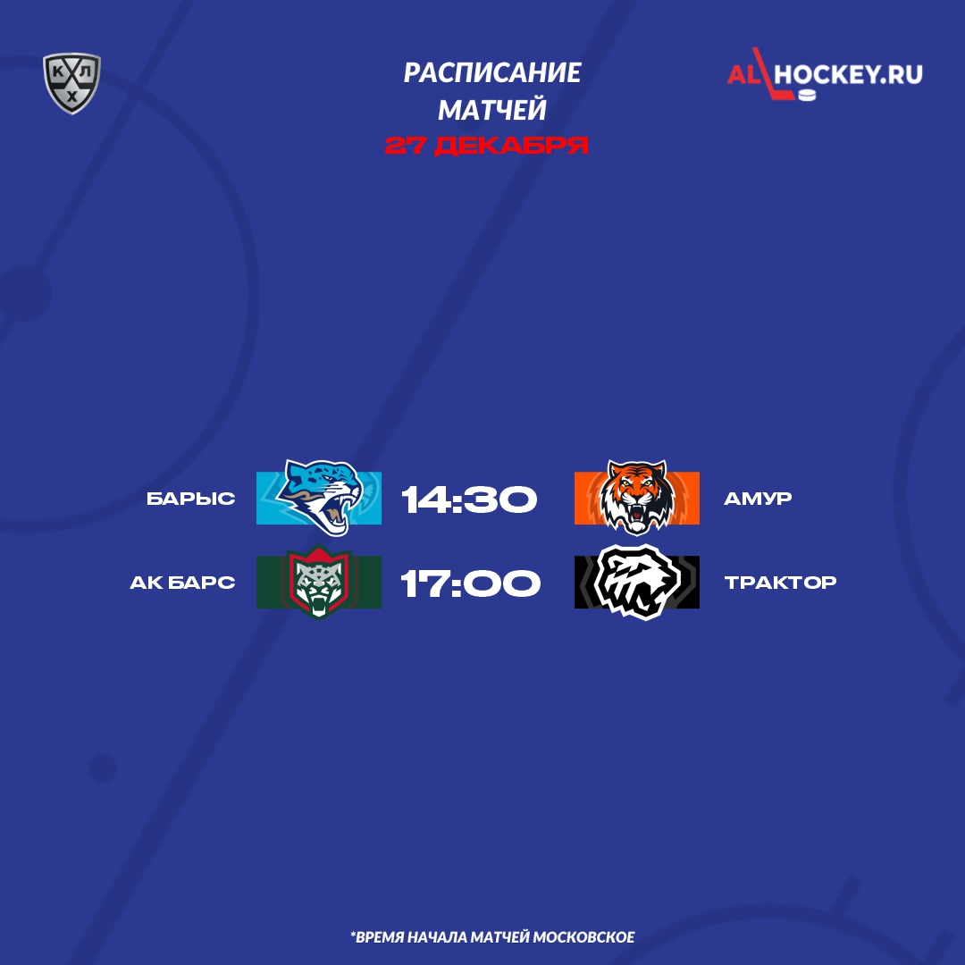 В среду, 27 декабря, Фонбет Чемпионат КХЛ предложит болельщикам два интригующих матча. В Астане состоится важнейшая битва за зону плей-офф между «Барысом» и «Амуром», а в Казани пройдет вторая в сезоне встреча между лидерами Востока: «Ак Барсом» и «Трактором».